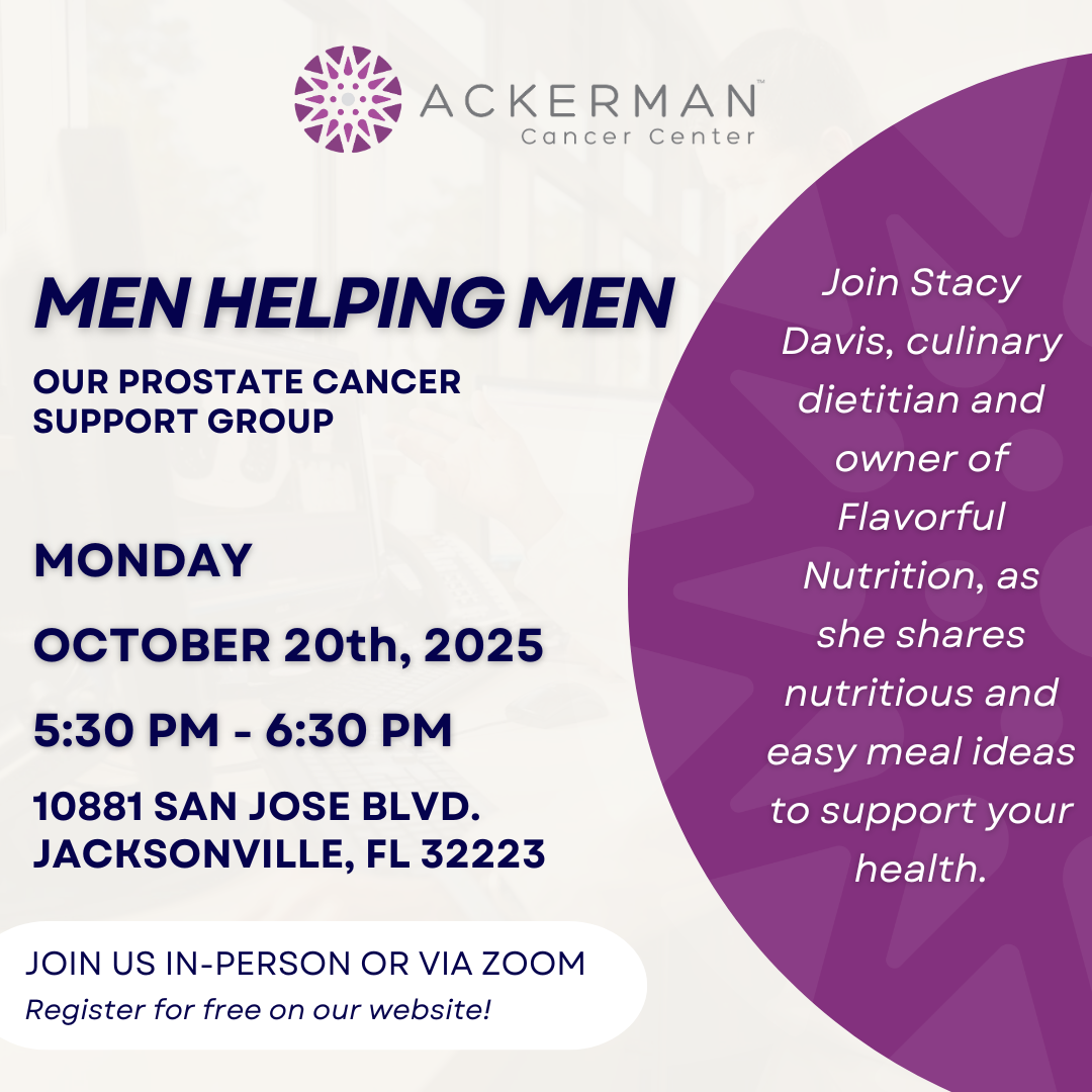 Ackerman Cancer Center 10881 San Jose Blvd., JacksonvilleJoin us Monday, October 20th, from 5:30 PM - 6:30 PM for our Men Helping Men- Prostate Cancer Support Group. Men Helping Men is our educational program that empowers men […]
